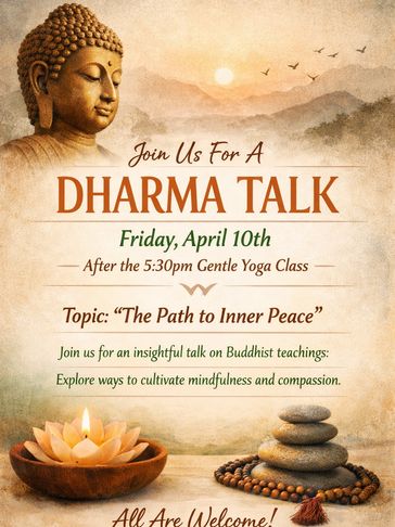 Join us for our upcoming Dharma Talk on Friday, April 10th, immediately following the 5:30pm Gentle Yoga class. This gathering is an opportunity to slow down, tune in, and explore the deeper teachings that support a more mindful, peaceful, and compassionate way of living.